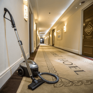 Hotels typically use commercial upright or backpack vacuums with HEPA filtration, strong suction, and ergonomic features designed for large floor areas and quick, thorough daily cleaning.