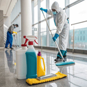 : upright, backpack, or canister (“pull-along”), built to survive years of daily use. Sebo and ProTeam are favorites for reliability; Nilfisk and Sanitaire are favored in schools and hospitals for robust filtration. On top of vacuums, cleaners use industrial disinfectants and floor cleaners—usually brands like Diversey, Ecolab, or Clorox Professional. Microfiber cloths and mop heads are swapped out multiple times a shift to avoid cross-contamination. Color-coded cloths and mops are standard for hygiene: red for bathrooms, blue for glass, green for public areas. Spray bottles are often refilled from concentrated stock, keeping things cost-effective and eco-friendly. Scrubbing pads, squeegees, dusters, and heavy-duty gloves round out the kit. Everything is chosen for efficiency, durability, and safety under heavy, regular use.